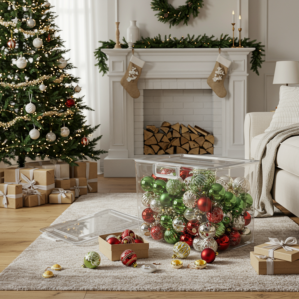 While holiday shopping, be sure to purchase large, CLEAR, stackable bins with lids for your post-holiday clean-up. All your holiday décor can be put away and stacked neatly… Best of all, you’ll always be able to see the contents without ever having to open the bins. Now this is a gamechanger!”