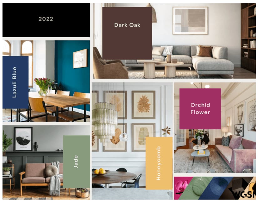 Introducing Dark Oak, Orchid Flower, Honeycomb, Jade, and Lazuli Blue, WGSN + Coloro's colors for 2022 and 2023. Whether painting or selecting accessories, consider weaving these colors throughout your home to create a soothing and grounding environment.